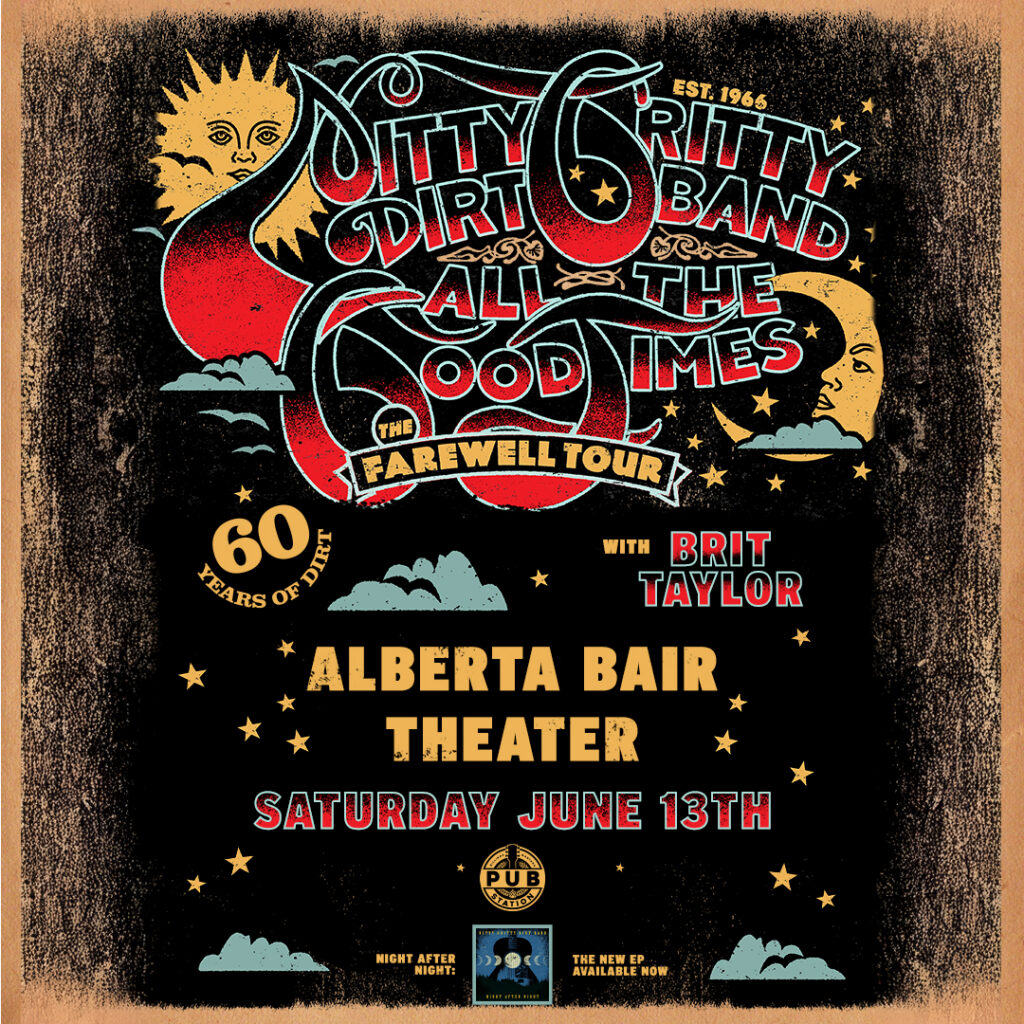Nitty Gritty Dirt Band. After 60 years of making some of the best American roots music ever recorded, the Nitty Gritty Dirt Band is hitting the road one last time. Their ALL THE GOOD TIMES: The Farewell Tour comes to Alberta Bair Theater on June 13, 2026, with special guest Brit Taylor and you don’t want to miss it.